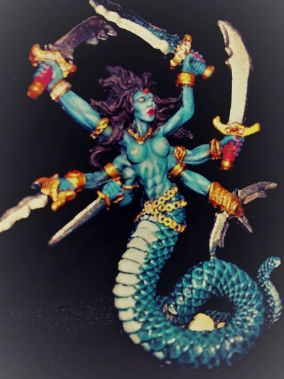 The Marlith is a major demon in every way, a creature of infinite cruelty and evil possessing timeless knowledge and power. A Marlith demon always manifests itself with the head and torso of a human woman but the body of a large serpent; they can easily reach lengths of 16 to 20 feet if they choose. It will have multiple arms (usually six or eight), all of which can utilize weapons, or items such as wands. The creatures have the strength of hill giants and the quickness of snakes. Marlith demons are believed to have Superior Magic resistance.