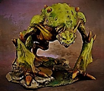 Type II Demons can come in an almost endless number of forms, but they are usually some kind of twisted cross between a vaguely humanoid form and something else. The “something else” can be almost anything, but frog-like and lizard-like forms are very common, and insect-like variations are numberless. These forms are usually extremely large, and as strong as Vrock demons, but in addition Hezrou demons typically possess powerful magical or poison-like abilities. They usually have poisonous bites or claws, they breathe toxic or noxious gasses or spit corrosive stomach fluids. Sometimes the blood from their wounds is poisonous, or corrosive. Reports exist of examples with barks or roars that cause fear, weakness, or even paralysis. In short, there’s almost no limit to the kinds of noxious abilities a Hezrou demon might have.