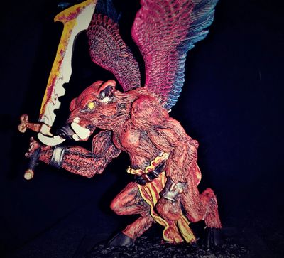 Vrock can be thought of as basic workhorse demons, the most common soldier of the Abyss. They are made from damned souls and warped into their hybrid forms by the Demons who trapped them. Vrock are considered the easiest demons to control -- with the term "easy" being extremely relative. They can accomplish simple tasks and follow straightforward orders, but they are not terribly intelligent, and tend to react to any adversity with simple violence.