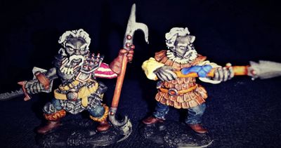 Gnolls are also of relatively low average intelligence and generally unsophisticated either individually orc socially. They live largely in tribal warbands, leading a nomadic existence emphasizing (we think) predation on other humanoids over development of a social infrastructure. They are accomplished leatherworkers, but appear to have little to no skill with metal, and none with building or engineering of any kind. Most gnolls use weapons that appear to be taken from other humanoid (or human) sources, although they do make their own bows (simple self bows, but very long and unusually powerful) and are respectable archers, often using fire-hardened bone-tipped arrows every bit as deadly as metal ones. Gnolls have simple shamanistic ability but demonstrate no arcane magical use.
