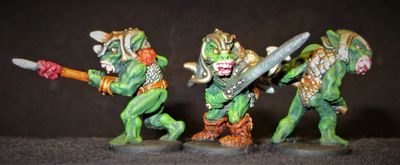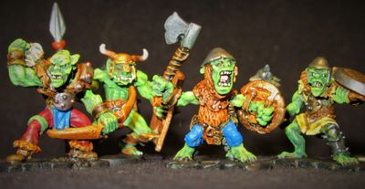 Despite living in large communities, goblins are highly chaotic creatures, which one must suspect leads to a lively social life. Goblin mobs are highly volatile, they are aggressive and will readily attack almost anything, yet they can be intimidated by an equally aggressive display of power. Goblins are quick to follow anything that looks stronger or more powerful than themselves, and they will equally turn on anything in an instant if they thing they have the numbers to overcome it.
