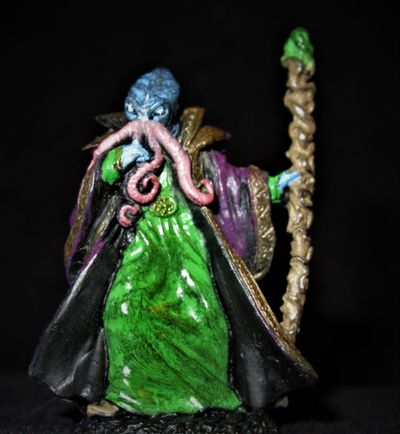 Ithilids are a fearsome sight, with the body of a man but a bright blue face sprouting reddish octopus-like tentacles from an enlarged head. Human sized, they are inevitably dressed in a wizardly style, always in sumptuous and wealthy garments, and they particularly favor sophisticated jewelry items with precious gemstones. More fearsome still is the reputation for evil these beings have, for they feed on brains, the brains of living and intelligent creatures, and they consider all other humanoid races to be nothing more than slaves and potential food reserves.