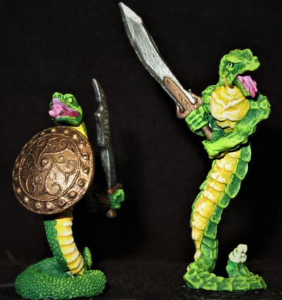 The Naga are the race of serpent-men. They are highly intelligent and socially sophisticated, and probably naturally magical as well. Almost all naga appear to have minor magical abilities equal to a first or second level magician, and their dedicated priest and wizard classes are probably human equivalent in potential ability. As warriors they are highly skilled, and their Guild rating of "5" should probably be seen as a bottom end more than an average. Leader-class or hero-type individual naga should be treated with exceptional caution by adventurers of any rank or skill.