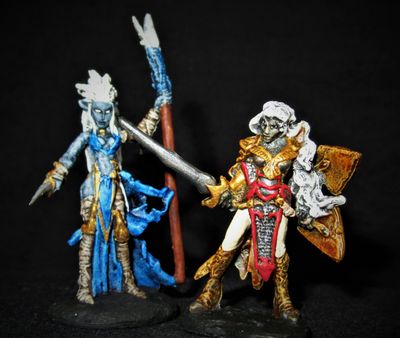 Drow elves are black-skinned, and have pale grey or white hair. Like upperworld elves, they tend to be somewhat slight of build, but they are anything but delicate. Their centuries of underground life have made them highly sensitive to bright light of any kind, but beyond this they have few weaknesses. Independent of those trained in the arcane or holy arts, all Drow are inherently magic-using. The ability to use dancing lights, faerie fire, and darkness spells appears common, and higher level individuals gain additional spell abilities. They also have superior magic resistance, which seems almost unfair in a race that is also so comprehensively magic-using themselves. They have excellent infravision and ultravision, a natural ability to move silently and with stealth, and are exceptionally alert, at least in their home environment. Perhaps because their society relentlessly culls out the weak, even ordinary individuals are always highly skilled, and they further tend to have good to superior arms and armor. Most are particularly skilled with a unique one-handed crossbow; direct damage is light, but the bolts are inevitably poisoned.