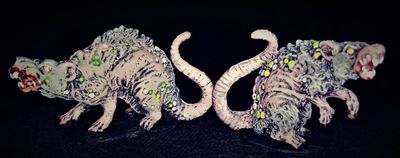 Plague Rats are horribly mutated gigantic rodents the size of small ponies. Their bodies are covered in disgusting sores and blisters, which constantly ooze pus and infectious fluids. These generate a disgusting smell which, at close range, induces nausea and choking. Worse, when struck by weapons, the abcesses and lesions will burst and spray infectious fluids on those nearby. Smashing weapons in particular cause extensive splattering, cutting weapons limit the spray to a reduced area, and thrusting/piercing weapons cause the least splashback.