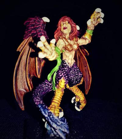 Harpies are winged female humanoids, magical creatures of evil disposition and believed indirectly related to devils. Harpies are powerful fliers, and are capable of grabbing and carrying heavy objects, including humans. They can fly as fast as a horse can run, perhaps faster. In combat, they attack with taloned hands in a rapid offensive frenzy, their magical nature gives them both speed and strength. They will frequently buffet an opponent with their wings, and a solid blow can knock a victim over. Many harpies also have a corrosive spit which has an acid-like effect on both armor and flesh.