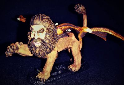 The Manticore is a true abomination. It has a lion's body and a man's head, it combines these with great bat-like wings and a tail that throws iron spikes in a whiplike action with deadly accuracy. They are large creatures, 10 to 12 feet in body length before the tail, and around 6 feet tall at the shoulder. Although it can fly, and fairly fast, it is not very maneuverable in the air and is more of a ground than air creature. They often make lairs in rugged areas that can only be reached by flying.