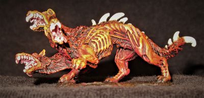A Cerberus Wolf is a three-headed wolf-dog, a breed believed to possibly have been originally spawned on the Planes of Hell but now apparently bred by the Frost Queen of Frostcrag Peak. They are large creatures, 12 or more feet long and as tall as a horse, although (unlike worgs) they do not appear to submit to the saddle. They are fast runners, and lightning-quick in combat. Each of the Cerberus Wolf’s three heads can deliver a vicious bite, and can breathe a short-range (about 20 feet) cone of fire, roughly similar in destructive force to a wand of fire.