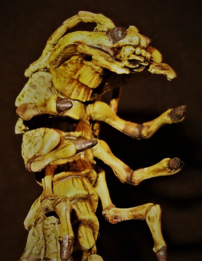 The anhkheg is a burrowing worm-like creature naturally found in forested areas, but one which frequently migrates into human-developed agricultural land as well. It is covered in a tough, chitinous shell, usually brown or yellow, large multifaceted eyes, and a powerful set of mandibles which can snap a small tree in a single bite. Ankheg have sensitive antennae which, when the creature is buried in the earth, detect surface movements of man-sized creatures up to as much as 300 feet away.